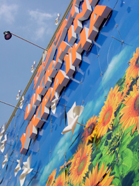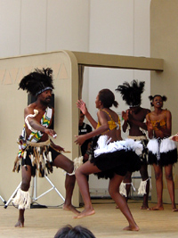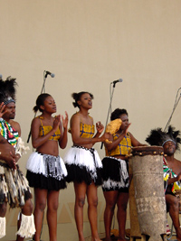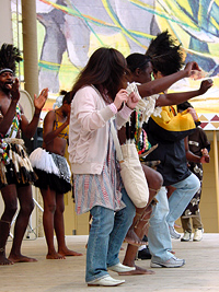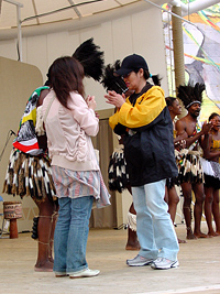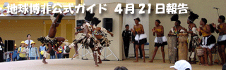 コモン5のステージではアフリカンダンスの熱演です。大小の太鼓と手拍子、よく透る歌声としなやかなダンサーの動き。単調ではあるが小気味良いリズムに幼児達が自然に踊り出し、舞踊の原点を見る思いで会場大拍手でした。最後は観客を舞台にあげ即席のダンスレッスンもあり万博らしく楽しいステージです。