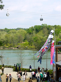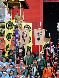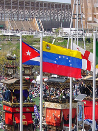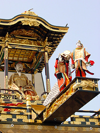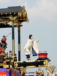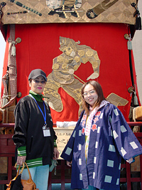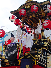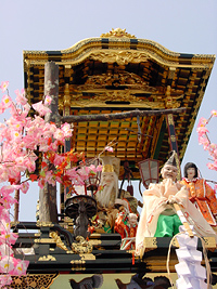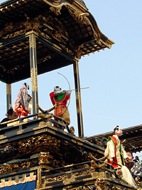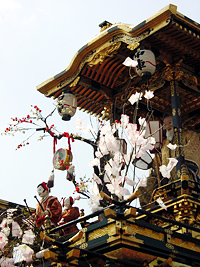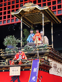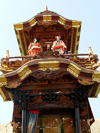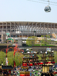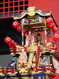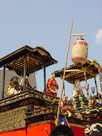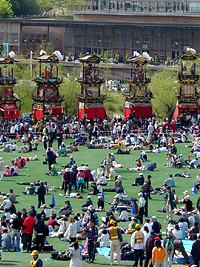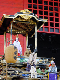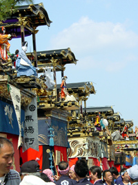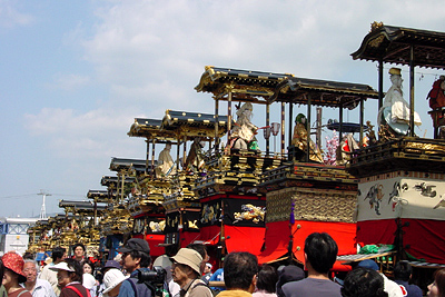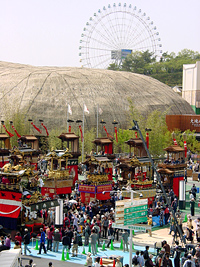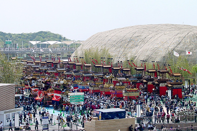 | 日本館前はごったがえしています。なんせ53両の祭り屋台は壮観かつ壮麗である。黒漆に金細工、精巧な彫り物タイプと白木に金糸刺繍で竜虎、鯉の滝登り等々飽きさせません。見台には嗜好を凝らしたからくり人形。とにかく見事です。 |