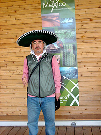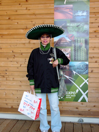 ツツジ池越に飛行機雲が印象的で、メキシコのソンブレロで記念写真、勢いでタコスなんぞに舌鼓。香草混じりの具に妻は拒否、エスプレッソの少量加減に疑問を持ちつつ愛・地球広場へ急ぐ。 |