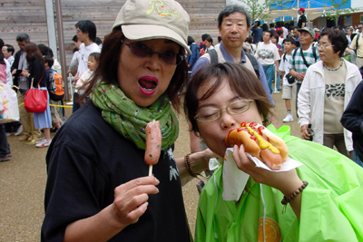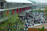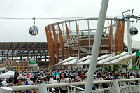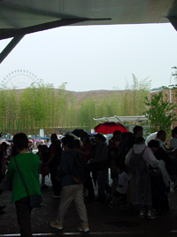 雨降りだというのにこの人出はどうですか。前回のドイツ万博の不評が嘘のようです。どこも行列で昼食もままならず、しかたなしにテイクアウトのピザパンをループの役立たず日よけの下で片寄せあい楽しみました。