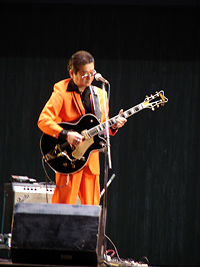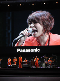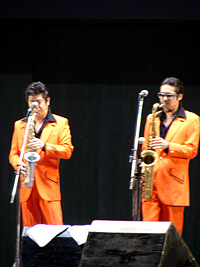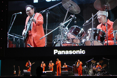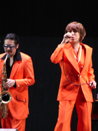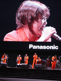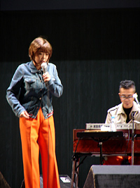 | 娘も仕事終わりで駆けつけ、最前列に席を占める。テンポよくオープニングを迎え、ユカリの熱唱が続き、ユーモア溢れるシャベリも快調で、広場もノリノリであっというまの45分でした。今日のいでたちはオレンジのスーツは良いが、シークレット・シューズはやりすぎです。おそらく10cmは上げ底で不自然、ぎこちない動きは考え物です。 |