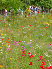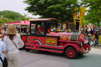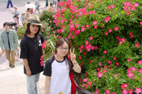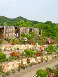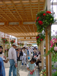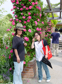 | さすがに人出は多く、入場券を買うところから行列。愛・地球博のパスポートを見せると200円の割引でした。入場してもごった返しており、とりあえず食事場所を求めて東口まできてしまった。途中の湖畔の美しいことに感嘆していると、見事なイングリッシュガーデンだと短期ではあるが留学経験のある娘がいいます。食事の後はローズアイスとサクラソフトに舌鼓。大行列のタワーはあきらめ散策開始とする。 |