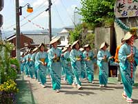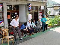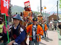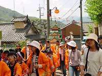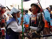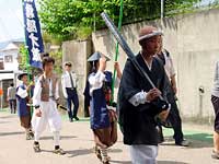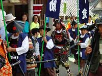 武者行列 ブラスバンドの先導でものものしい行列です。通りには椅子を持ち出し見物する家族も。行列に参加する人も見物する人もほとんど顔見知り。祭りにあわせて帰郷する人が多く、久々の懐かしい顔も有りコミュニケーションの原点が見られます。