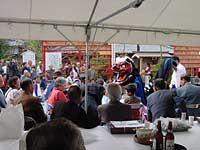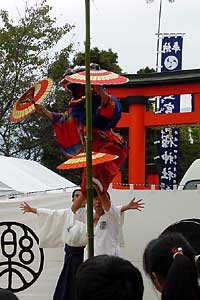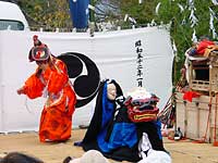 神社の境内に筵敷き。つい4〜50年前までは盛んに催された、神事と演芸が結びついた鎮守の祭りが再現されました。