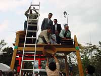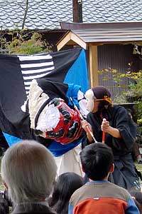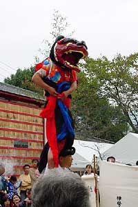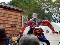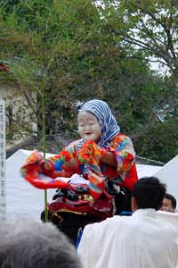 いよいよクライマックス、太夫の見せ場です。肩車されたままで獅子舞からオカメへの変身。