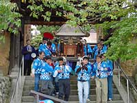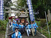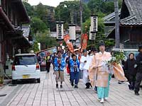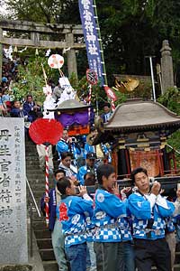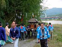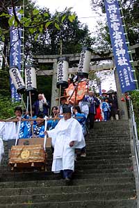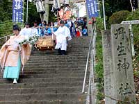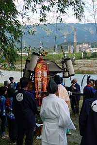 恒例の餅まきも終了し、いよいよ神輿渡御の神事です。神主を先頭に具物や堤灯、旗指物も仰々しく神輿行列が、目もくらむ石段を下り、丹生郷を練り歩き紀ノ川の河原へ向かいます。