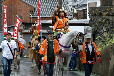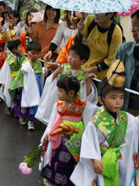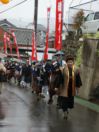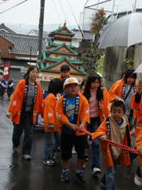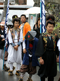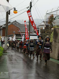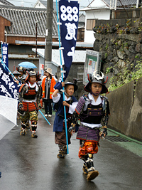 2009年5月5日:いやな予感で朝からの雨、祭りの出足をくじく。今年は各家のお人形を通りに向けて飾りつけ街角コンサートも行われ、100年前の雛人形の表れ、いつもと様子が変わった真田祭りでした。雨にもかかわらず行列も盛況で稚児行列も可愛らしく傘の屋根で守られていました。