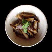 牛肉は一口大にし、ごま油を熱した鍋に入れ、軽く火を通し、砂糖と酒をいれそのあと醤油で味付けし取り出す。残り汁にゴボウを入れ、だしとミリン・醤油を加え、おとしぶたをして6〜7分ていどゴボウがやわらかくなるまで煮る。取り出した牛肉をまぜて、汁がなくなる程度煮しめて出来上がり。上に木の芽をのせると、いろどりがよくなる。
