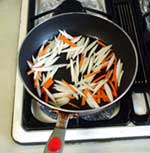かぶの皮とニンジンを3〜4cm程度に切り、サラダ油でいためて皮がしんなりしたら、酒少々をまわしかけ、アルコールがとんだら醤油をフライパンのまわりにまわし入れる。好みでタカのつめの種をぬいて一緒にいためる。