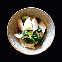 かぶの葉のじくを葉より少し先にうでて、時間差をつける。ごまはあまり細かくすらず、風味と歯ごたえを残す。出来上がりを食べて味がうすければ、醤油をまわしかける。