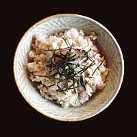 といた米とだし又は水を入れ、煮たコンニャク・椎茸、うす揚げ・ぜんまい・ニンジン・ホタテを加え、炊き上がったら、器に盛り焼のりを細かくしてかける。