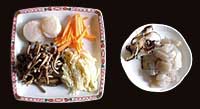 コンニャクを塩でもみ、熱湯で3分ほど湯がいたものを薄く切り、巾1cm程度の長方形にする。干し椎茸は半日ほど水でもどし細く切る。コンニャクと椎茸を醤油と味醂・だし各大さじ1で汁気がなくなるまで煮ておく。うす揚げは熱湯で表面にまわしかけ、油っけをのぞき、巾2〜3ミリ程度に切る。ぜんまいは水煮でも乾燥したものを水にもどしたもの、どちらでもよいが、長さ5cm程度にそろえて切る。ニンジンはマッチ棒程度に切っておく。ホタテは冷凍でも生でも缶づめでもよい。細かくばらしておく。缶づめは汁部分もだしと一緒に炊き込む。