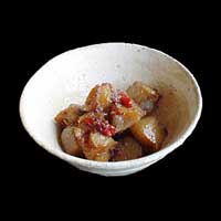 お酒の口取り的一品で、少々ぴりからにするのがポイント。子供のおかずには向かないかもしれないので、他にコンニャク料理を作ったときの残りコンニャクを利用すると、お父さんに喜ばれる。 コンニャクはカロリーもなく、食事制限やダイエットに向いている。丁寧に味をコンニャク自体にしみこませるよう、少し時間をかけて料理をすると見違えるような味付けになるからお試しください。