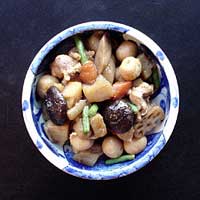 サトイモなど煮くずれしないように注意。最後に溜り醤油を香りと色つけにふりかける。汁気が無くなるまで味をふくませる。器にとって、ゆでた絹さやのせん切りをのせる。 |