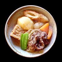 鍋に牛肉をしきならべ中火で加熱、肉の色が変わったら、だしをそそぎ一煮立ちさせ、肉のアクを取り除き調味料を加え、材料を入れ煮立ったら、中火にしてだし汁が1/3程度になるまで煮込む。煮込むときはおとしぶたをしておく。