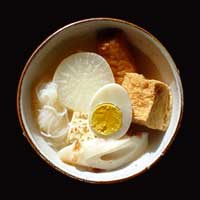 下ゆでした大根を鍋のそこにならべ、他の具を入れてだしを注ぐ。酒と塩をいれ中火で沸騰する前に中弱火にして、静かに1時間以上焚き、その後3時間程度さまして味を十分しませる。食卓に出す前に醤油とミリンを加え、塩で味を調える。