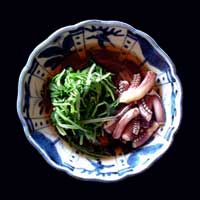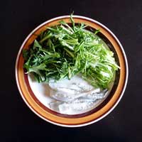 鍋に入れる順番はイカゲソ、シメジ、水菜のじくの部分。最後に葉の部分を入れて、中火弱であまりに過ぎない。 イカゲソがかたくならないよう注意。煮浸しは煮汁がさめる時に、味がしみ込むため鍋にいれたままさます。