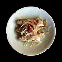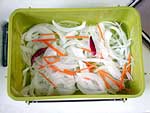 大きめのタッパウエアーに、よく洗ったタマネギとニンジンを敷き、揚げたてのアジをならべて、鷹のツメを散して、その上から野菜をのせて、分量の南蛮だしを熱して、全体がかぶる程度そそぐ。完全に冷めるまでふたはせず、冷めたら冷蔵庫に。3時間程度したら食べられるが翌日が美味しくなる。2日ほどは冷蔵庫で保存がきく。
