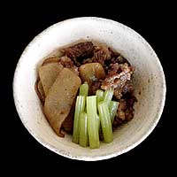 すじ肉は1口大のおおきさに切り分け、1時間ほどゆでてアクをとりのぞき、串が通るほどのやわらかさに煮る。