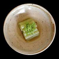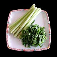 「ふき」全ての料理の下ごしらえとして、ふきのじくと葉に分け汚れ洗い、葉のいたんだ部分を取り除く。じくは鍋に入る長さに切り、塩をまぶし、まな板の上で転がす。皮は取らずに、沸騰した鍋にいれ5〜6分程度煮てから、冷水に取り皮をむき取る。葉も2mmほどにきざみ、同様に2〜3分ほどゆでる。大きめの葉はたてにも切り目を入れると、葉が団子状態にならなくてすむ。