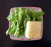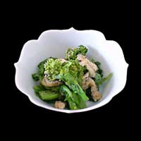 菜の花は塩をいれて湯がく。湯がく時間は30秒程度でよい。水気をしぼり適当な長さ約3cm程度に切る。
