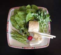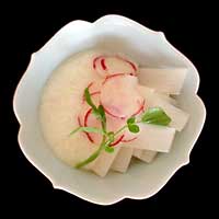 ヤマイモとウドを器に盛り好みの量の酢と溜り醤油をかけ、ラディシュの薄切りとクレソンをのせて出来上がり。簡単な一品。