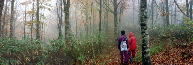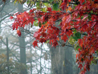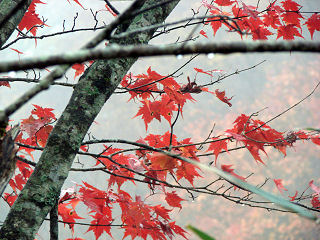 今週末がせせらぎ街道の紅葉は最高という情報を聞いて予定していたが名古屋を出発する時は今にも降りそうな気配。降っても昼からは上がるという天気予報を信じて出かけた。着いたときは小雨が降っていたが西ウレ峠の管理棟から頂上経由の約3キロ、累積標高300mの道のり、昼食前の良い運動となった。このような天気であったが結構な人出だった。