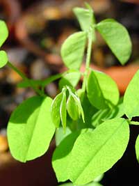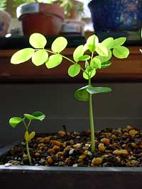 2004年12月6日:季節外れな台風くずれで強風の翌日に、いそいそと瑞穂グランド西公園に種を拾いにいき、鳩と競争でゲットした貴重な種です。エンジュは大木で当然、手の届く範囲に種はないので、一風欲しかったときに狙い通りの強風でした。木に生っているときは瓢箪のような、くびれすぎの豆のさやのような独特の実です。