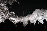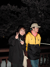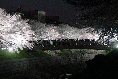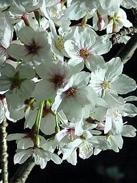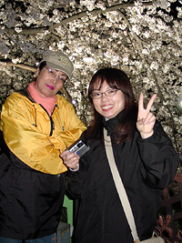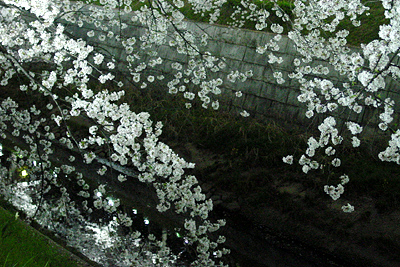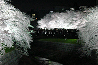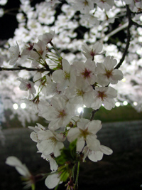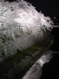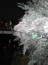 2005年4月9日:翌日は夜から雨の予想で、今日しかないのである。夕方から家族で山崎川の夜桜と洒落こみました。思った以上の人出でパトカーもやっきになるが、そこは人情の世界、一目夜桜を拝みたい人達で沿道は一杯でした。ライトアップ特有の幻想的な春の宵に大満足でした。