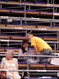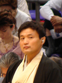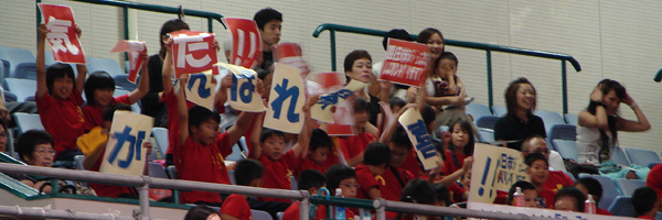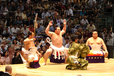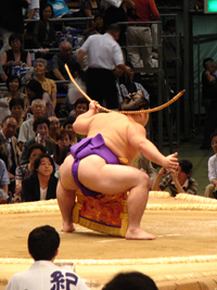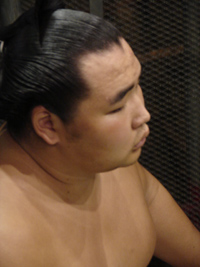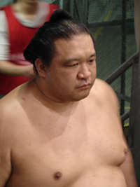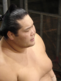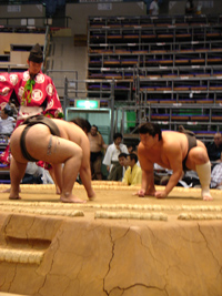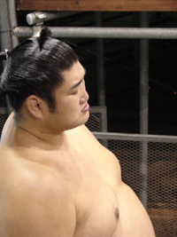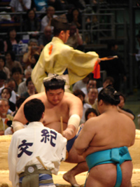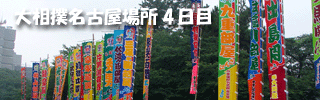 | 地元の幼稚園児の熱い声援に琴光喜は慎重に相手を押し出した。今のところ万全である。この日の朝青龍は不戦勝であったが精彩がなった。 |