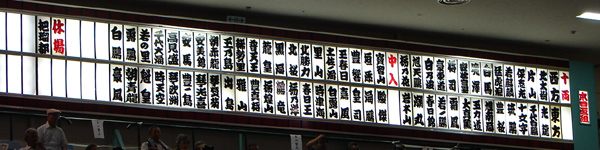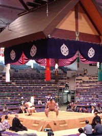 | 生憎の雨降りですが毎年のことで意に介しません。地下鉄に乗った時からお相撲さんのビン付け油の香りがするようで市役所駅では雪駄に浴衣も目に付き興奮気味です。午前11時には入ります。前相撲から幕下・十両と、お相撲さんの体格、肌艶の変化を見るのも楽しみです。 |