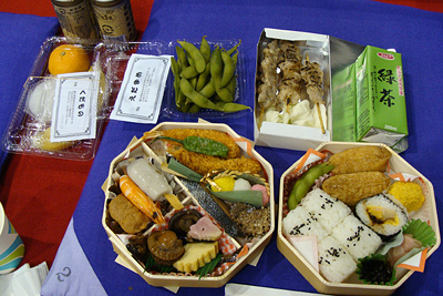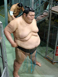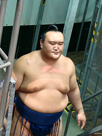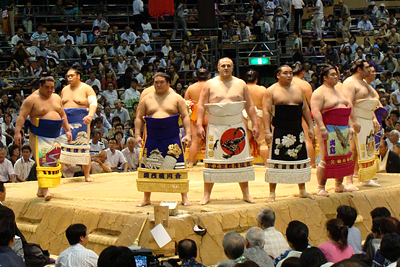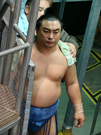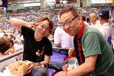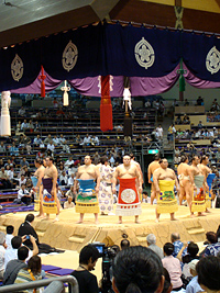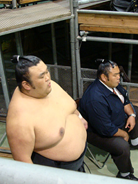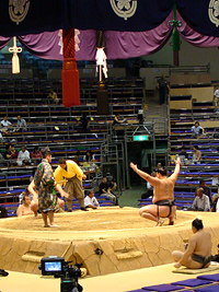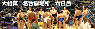 | 地下鉄の駅までは大雨、市役所駅で降りたときは雨が止み、それはそれは蒸し暑い名古屋場所です。櫓下から前相撲の若いお相撲さん達が風呂敷包みを片手に行き交います。一汗かいて席に落ち着き、弁当を使い、観戦の態勢を整えます。 |