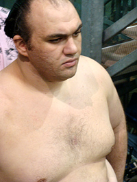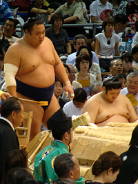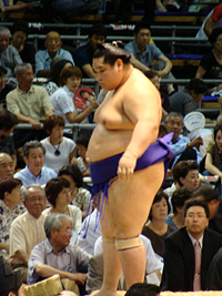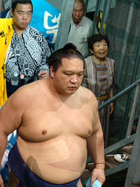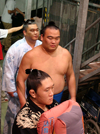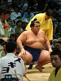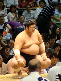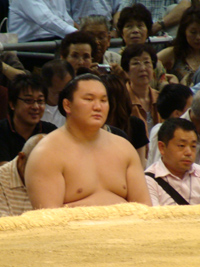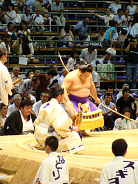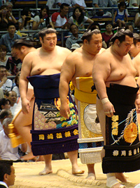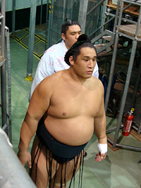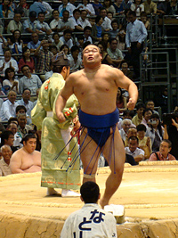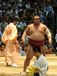 | 白鳳の土俵入りである。その後に朝青龍の休場が発表され会場はブーイングの嵐となりました。 |
