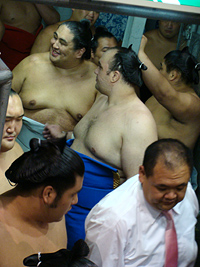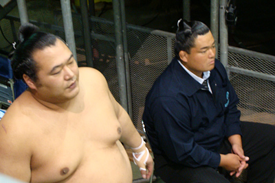| 昨年の不祥事を受けた形の新・時津風親方と弟子の豊ノ島。特に会話はなかったがアイコンタクトだけで伝わるものでしょう。 |