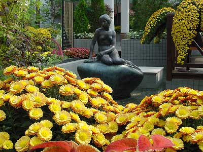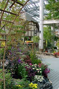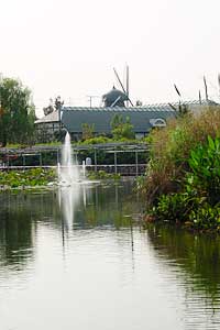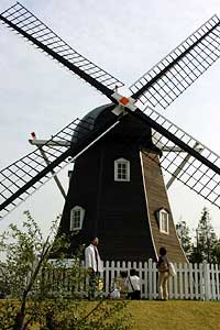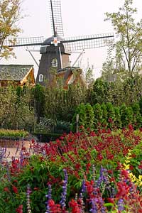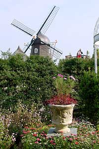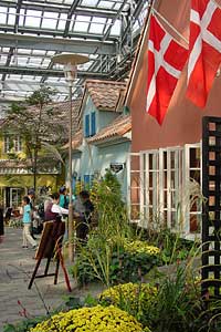 デンパーク館の洋風庭園とフローラルブレイス(温室)。写真館では、デンマークの民族衣装を着て写真を撮ることができます。