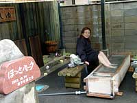 2003年4月26日:鳴子温泉に泊まり、娘がどうしてもと言うので足湯を探して早速実践。ぬるかった。