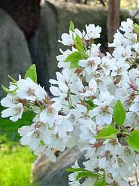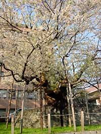 元南部家家老の屋敷跡・盛岡地方裁判所前の巨大な花崗岩の割れ目から成長したエドヒガンサクラ。樹齢350年の幹周りは荘厳さを感じます。昭和7年の大火の時、怪我をしながらさくらを守った庭師のエピソードもあり、市民に愛されているさくらです。今年は23日に咲き始め、訪れた日は満開で歓迎してくれました。