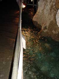 2003年4月27日:ようやく晴れて龍泉洞に潜る。ひんやりとして神秘的な洞窟探検にワクワクしながら奥へ進む。地下水が豊富でゴーゴーとうなる水音をものともせず、登り降りの連続で大汗をかき、見学できる700m地点からの登りの階段はそうとうにきついです。洞内の奇岩や垂れ下がった石柱に感嘆の声をあげながら楽しめました。