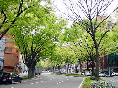 2003年4月30日:杜の都・仙台の朝。ケヤキの新緑が、牛タンと稲庭うどんをいただいた目にまぶしい。