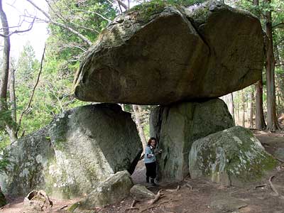 続石:遠野物語弟91話にでてくる巨石遺構。山道をかなり登ります。巨石信仰は人類の基本を実感。有り様が不自然なため古代人の墳墓かもしれない。他に「泣き石」「不動岩」がある。