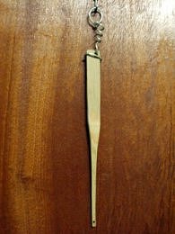 チャンゴの先生の練習室の トイレの鍵についてたもの(笑)。 捨てると言ってたので、もらって来た。 (ちゃんと洗ったよ。)チャンゴのバチ型。 グルグルの針金は私がつけた。 |
