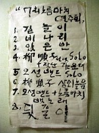 | チャンゴの先生のライブプログラム。 99年に月1で練習室ライブを 行なっていた頃のもの。プログラムは 毎回先生が筆で書いていた。 ずっと壁に貼ってたからボロボロ。 |