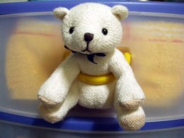 | 帰国してしまった語学堂のともだちに もらったもの。我が家にはクマのぬいぐるみが やたら多い。知らず知らずのうちに 集まってしまった。数えてみたら6匹もいる…。 このクマ君には引き出しを守ってもらってます。 |