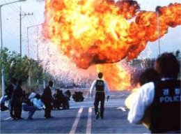 クライマックス場面。現金輸送車爆発。 この写真のどこかにゆこがいます。 多分見えないけど。エキストラってのを 初体験しました。この場面の撮影は1週間。 「つながり」があるので同じ服同じ髪型1週間。 毎日宿舎に戻って服を洗って乾かすのが 大変でした。毎日生乾き状態(涙)。 |
