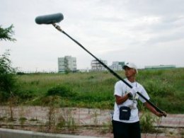 | 録音部のブームマンI君。 製作部、撮影部、照明部、録音部、 特機部、演出部、美術部、小道具部、 そして通訳部・・・。それぞれのチームが うまく連携して撮影を進めていかなければ いけない。通訳部の役割は大きい。 |
