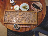 東北では、客人をもてなす際、もち料理で歓迎する慣わしとのこと。有名な<ずんだもち>やあんこもち・雑煮がならびます。しょうがもちが、非常においしくて、おかわりしたかったです。作法は、甘いものから順に食べ、間に大根おろしで口をキリッとさせるとのことでした。