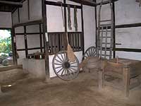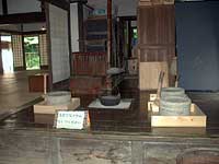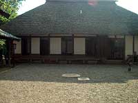 江戸時代後期に建てられたもので、寄せ棟・茅葺き・田の字型の間取りという、典型的な日本の民家建築です。徳丸地区から移築。