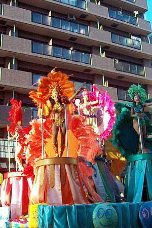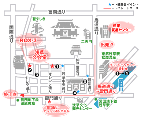 馬道通りの松屋北口(浅草2丁目交差点)を出発し、雷門通りのすしや通り入口迄、出場者35団体/4100名がサンバ音楽やダンスを繰り広げ、本場ブラジル人ダンサーによるすばらしい衣装やダンス、演奏による華やかなステージも披露されます。