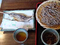 | 前日は三陸海岸を北上し、今朝は久慈から南下、平庭高原の白樺林に感激し、峠を下ると葛巻・高家領「森のそば屋」がある。町内の婦人会が運営し、自前のそばを自前の水車で挽き、店の二階で打ったそばを食べさせる。豆腐と卵をつぎに使ったそばは繊細で格調高いくのど越し良好。どういう訳か雑穀ごはんが付いていて、隣の囲炉裏で焼いたアマゴもとてもおいしかったです。 |