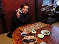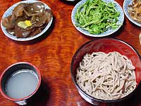 | 「大石田そば街道」にも14軒の蕎麦屋が点在している。「七兵衛そば」では、辛味大根のおろし汁にソバツユを好みで調合。そばは食い放題のシステム。付け合せの山菜の漬物も野趣あふれ、なかでも「きくらげ」の丸ごとを辛子でたべるものは初の体験で興味を引いた。もちろん、そばのお替りをお願いして大満足。このあたりは、米がとれず、農家はだれでもそばが打てるらしい。そばは来客時の接待料理で、食い放題はもてなしのスタンスと言う。 |